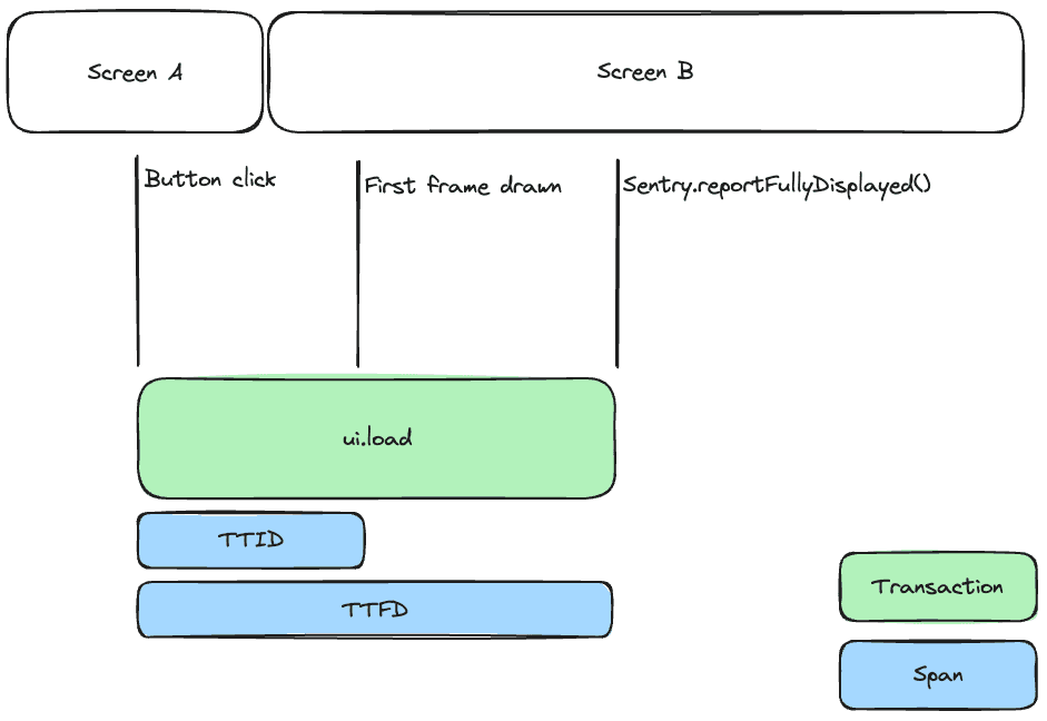 By adding a span for each launch of an activity, time to initial display (TTID) provides insight into how long it takes for your activities to launch and draw their first UI frame. The SDK sets the span operation to ui.load.initial-display