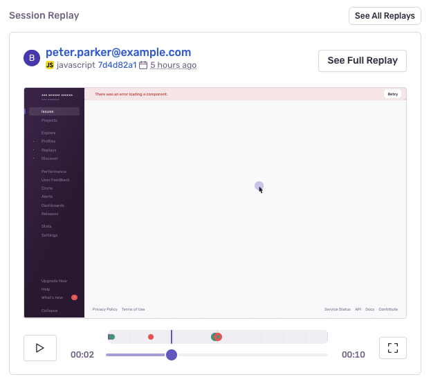 If you’ve enabled Session Replay, you’ll have access to a replay preview on the page (if there’s one associated with the event). Replays can be associated with both frontend and backend errors, as long as distributed tracing is set up. From here you can navigate to the rest of the replays recorded for this issue, or inspect this replay on the Replay Details page.